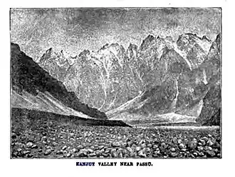 - 1 2 3 J. Biddulph, Tribes of the Hindoo Koosh, Calcutta: Office of the Superintendent of Government Printing, 1880 [dostęp 2021-03-19] [zarchiwizowane], Cytat: „In Wakhan, Sirikol, and Yarkund, the name of Kunjoot is given to Hunza, though this name is not in use among the inhabitants themselves, nor among any of the people dwelling south of the Hindoo Koosh. The name, according to the pronunciation of the inhabitants themselves, is more properly Hunzoo. In ancient times it was called Challaj Bultum, a name which has now fallen into disuse.”.