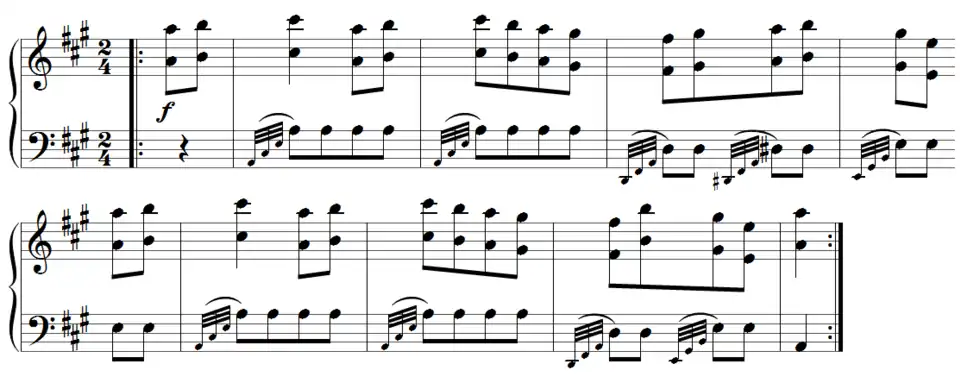 Charakterystyczny rytm i przednutki obecne są również w partii lewej ręki w pasażu Marsza tureckiego z IX Sonaty fortepianowej Mozarta: