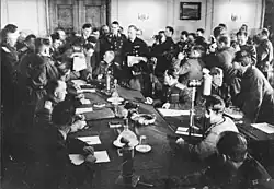 ![]() Feldmarszałek Wilhelm Keitel podpisujący akt kapitulacji Wehrmachtu, 8/9 maja 1945. | |||