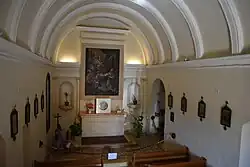 Wewnątrz kaplica ma prostokątny kształt i jest zadaszona sklepieniem kolebkowym, spoczywającym na siedmiu łukach, wznoszących się z wysoko umieszczonego gzymsu, który obiega cztery ściany kaplicy. Jedyny ołtarz kaplicy znajduje się naprzeciw głównego wejścia. Na nim włoskie marmurowe tabernakulum, które w 1960 zastąpiło stare, kamienne[2][6].