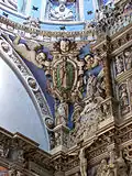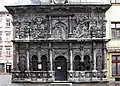 Fasada (elewacja zachodnia) pokryta jest gęstą dekoracją rzeźbiarską, dziełem Johanna Scholza. Podzielona jest sześcioma kolumienkami i dwoma gzymsami na trzy kondygnacje.