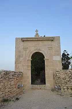 Aby dojść do kaplicy należy przekroczyć bramę, prowadzącą na stary cmentarz ofiar epidemii dżumy. Bramę tę stanowi jeden z dwóch portali zabranych w latach trzydziestych XVII wieku z rozebranego starego kościoła parafialnego w Żurrieq[1][2].