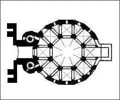 Historyczny kompleks tworzyła kaplica i położony na północ pałac cesarski. Kaplica miała plan zbliżony do koła, z niewielkim prostokątnym prezbiterium oraz westwerkiem poprzedzonym prostokątnym atrium. Natomiast pałac miał plan prostokątny, pośrodku dłuższych boków znajdowały się półokrągłe absydy. Także półokrągłe zamknięcie znajdowało się od strony zachodniej. Oba ściśle oparte na osi zachód-wschód założenia były połączone prostopadle usytuowanym gankiem.