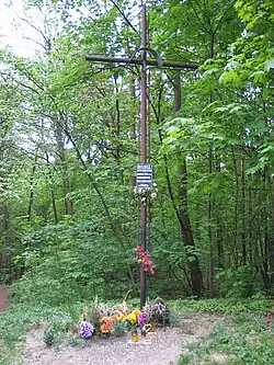 ![]() Tablica informacyjna w miejscu kapliczki św. Walentego, zniszczonej w 1941 r. | |||||||||||