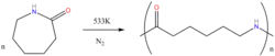 Inną metodą jest reakcja cykloheksanonu z kwasem nadoctowym. Produktem przejściowym tej reakcji jest kaprolakton: