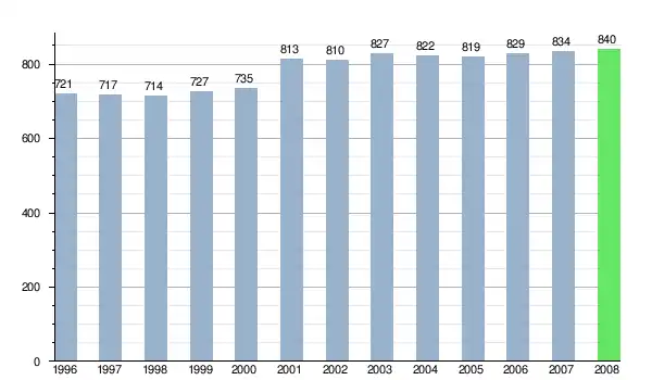 Według danych z dnia 31 grudnia 2012, wieś zamieszkiwało 886 osób, w tym 470 kobiet i 416 mężczyzn[6].