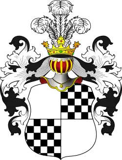 Na tarczy czterodzielnej - I i IV pole srebrne, II i III szare. W klejnocie trzy pióra strusie.