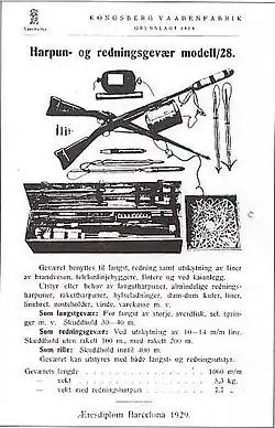 W dwudziestoleciu międzywojennym wielu rusznikarzy norweskich usiłowało zbudować karabin harpun, mogący służyć zarówno do polowań na foki, jak i wystrzeliwania lin ratunkowych dla łodzi będących w niebezpieczeństwie. Ze względu na obecność na rynku i w magazynach wielu tysięcy karabinów Jarmann, Våpenfabrikk w Kongsberg zaprojektowała na jego podstawie karabin harpun oznaczony jako M28.[1] Przeróbka polegała na usunięciu magazynka, skróceniu lufy i kolby i usunięciu mechanizmu przeładowania. Dodano grubą gumową poduszkę naramienną, aby zmniejszyć efekt odrzutu, który był dość znaczny przy wystrzeliwaniu tak ciężkiego pocisku, jakim był harpun. Karabin strzelał ślepym nabojem 10,15 × 61R. Skrzynka zamocowana pod łożem zawierała do 300 metrów cienkiej liny. Karabiny harpuny M28 produkowano do 1952 roku, kiedy to zaczęto używać harpunów na bazie karabinu Mauser Kar98k oznaczonym jako M52. 1911 Jarmannów zostało zmodyfikowane do wersji M28, z czego około połowa po II wojnie światowej.