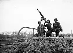 Broń była wyposażona w trójnożną podstawę, przy czym każda noga miała regulację długości. Podstawa miała masę 18,5 kg[15]. Pierwotnie broń miała dwuczęściową pancerną tarczę ochronną o grubości 7 mm i masie 40 kg[15].