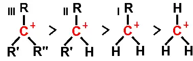 Szczególnie nietrwałe i reaktywne są karbokationy alkilowe. Ich trwałość zależna jest jednak silnie od ich rzędowości, tzn. od tego, czy ładunek dodatni znajduje się na atomie węgla, do którego jest przyłączony jeden inny atom węgla (pierwszorzędowy), dwa takie atomy (drugorzędowy), czy trzy takie atomy (trzeciorzędowy):