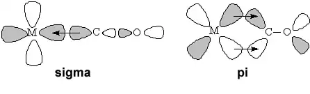 Wiązanie σ jest wiązaniem koordynacyjnym, w którym funkcję donora elektronów pełni karbonylek – samo w sobie jest ono jednak energetycznie niekorzystne i, jak dowodzą obliczenia kwantowo-mechaniczne, jest ono właściwie lekko antywiążące. Cały układ jest dopiero stabilizowany przez wiązania π między orbitalami sp tlenku węgla i orbitalami d metalu, przy czym rolę donora elektronów odgrywa tu metal, a nie karbonylek (jest to przykład tak zwanego „wiązania zwrotnego”)[4].