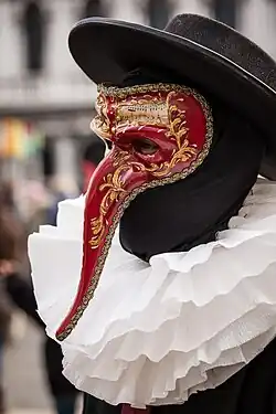 Wśród publiczności karnawałowej przerażenie wzbudzały kostium i maska wzorowane na stroju doktora zadżumionych (medico della peste). Postać doktora czasów zarazy była okryta czarną płachtą posmarowaną woskiem, na głowie miała duży czarny kapelusz, a na twarzy maskę z długim zakrzywionym nosem przypominającym dziób ptaka. W stroju prawdziwego medico della peste był on wypełniany ziołami (tymiankiem, rozmarynem i goździkami), a czasem gąbkami nasączonymi octem[35]. Ich zadaniem było filtrowanie powietrza zasysanego przez dwie szczeliny, które po jednej znajdowały się po obu bokach, oraz neutralizowanie brzydkiego zapachu ciał umierających zadżumionych osób[27][31]. Ubiór „mający zapobiegać zarazie” został wymyślony w XVI wieku przez francuskiego lekarza Charlesa de L’Orme’a[35][36] w 1619 roku[37]. Dłonie medyk ochraniał rękawiczkami, stopy butami, do których przywiązywał nogawki spodni. Małe okrągłe otwory na oczy były zakryte szkłem[36]. Do badania chorych lekarz używał drewnianego drążka, aby unikać bezpośredniego kontaktu[35]. Tak odziani lekarze odwiedzali pacjentów podczas epidemii dżumy[36]. Ubiór ochronny był noszony głównie przez medyków we Francji i Włoszech[36]. Wenecja, będąca miastem portowym, była stale narażona na zarazki przywożone na statkach z innych odległych miejsc[38]. Straszliwe epidemie nawiedzały Wenecję od drugiej połowy XVI wieku do lat 30. XVII wieku[35]. Z czasem ubiór „mający zapobiegać zarazie” stał się jednym z głównych weneckich przebrań karnawałowych i jest nim także w XXI wieku[36].