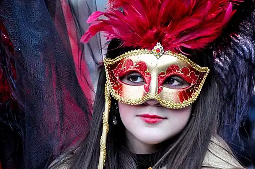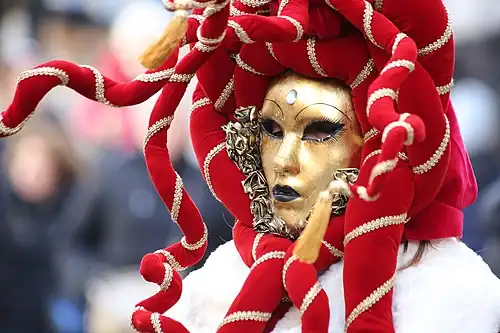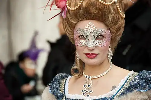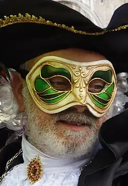 Tradycyjne weneckie maski karnawałowe to: baùta, morèta, volto, medico della peste i gnaga (przypominająca pysk kota i zakrywająca twarz od nosa w górę[31], używana przez mężczyzn, którzy przebierali się za kobiety[34])[31].