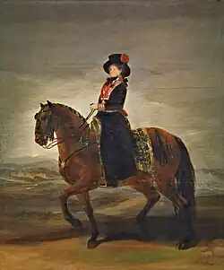 Goya inspirował się konnymi portretami królowych Małgorzaty Austriaczki i Elżbiety Burbon Velázqueza. Znał dobrze te dzieła, gdyż w 1778 wykonał na ich podstawie rysunki i ryciny. Tym samym odszedł od tradycji portretów na koniu stającym dęba, symbolizującym władzę, na rzecz majestatycznego, spokojnego ujęcia. Malarz został poproszony także o sportretowanie królewskich koni. Mimo inspiracji Velázquezem, konie Goi są bardziej dynamiczne niż te na obrazach jego mistrza[5]. Podobnie jak w przypadku Portretu Marii Teresy de Vallabriga na koniu[6] Goya miał trudności z proporcjami – błędy widoczne są w zbliżonym rozmiarze przednich i tylnych nóg królewskiego wierzchowca. Aby kolor ziemi nie zlewał się z nogami konia, Goya dodał srebrną wstęgę strumienia[7].