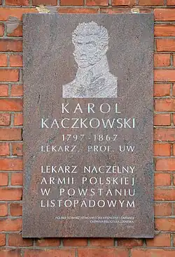 Karol Maciej Kaczkowski (ur. 4 lutego 1797 w Warszawie[6], zm. 14 września 1867 w Chersoniu[7]) – polski lekarz, profesor Uniwersytetu Warszawskiego, lekarz przyboczny księżnej łowickiej[8], pionier medycyny ratunkowej[9]. W randze generała naczelny lekarz armii polskiej w powstaniu listopadowym[8].