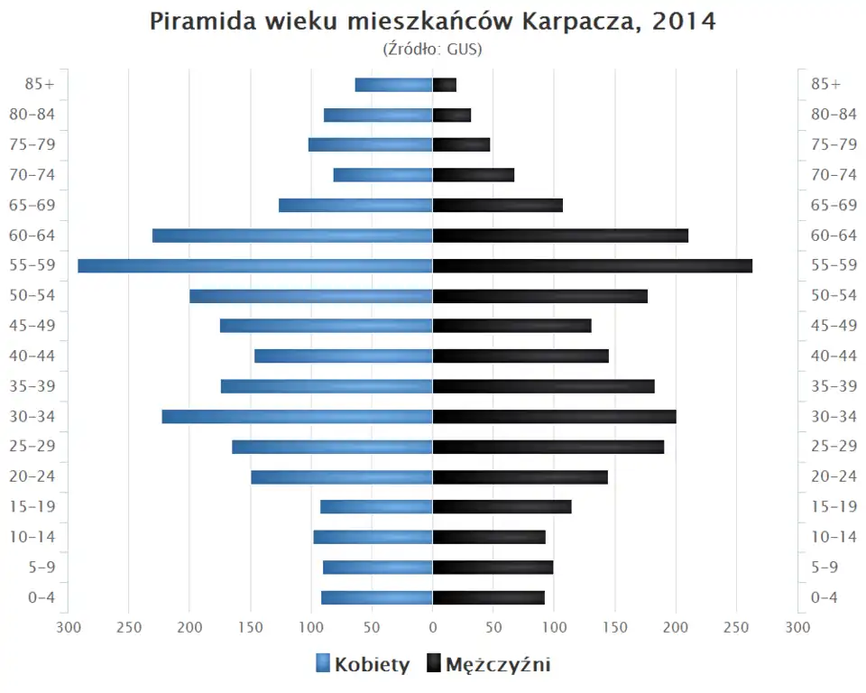 Piramida wieku mieszkańców Karpacza w 2014 roku[8].