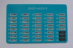 - ↑ Przykładowo Deutsche Bank Polska PBC SA stosował karty TAN stuhasłowe (10 wierszy × 10 kolumn) o hasłach dwucyfrowych; do autoryzacji transakcji należało podać dwa hasła.