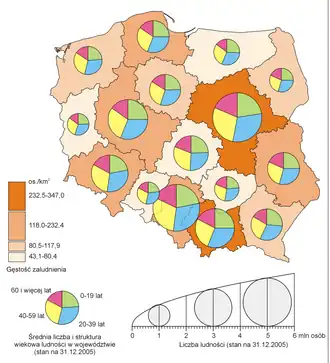 - mapa z zaznaczonymi miastami, na których wielkość diagramów - kół odpowiada liczbie ich mieszkańców