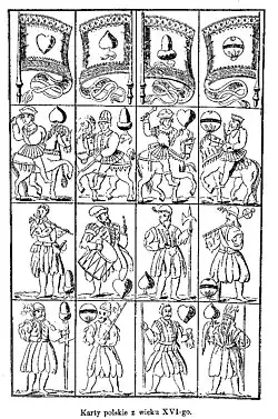 Gra w karty pojawiła się w Polsce w XV wieku razem z gośćmi z Europy, mieszkańcami miast[12]. Publikacja De Ludorum Abstinentia, wydana w 1456 roku w Krakowie, zabraniała gry w karty na Uniwersytecie Krakowskim. Nieco wcześniej, w 1453 roku, płomienne kazania w Krakowie wygłaszał franciszkanin Jan Kapistran, we Wrocławiu palił karty do gry z innymi zbytkownymi przedmiotami. Inny franciszkanin i filozof, Thomas Murner, około roku 1500 uczył w Krakowie logiki przy pomocy specjalnych kart swojego projektu, wykonanych zapewne w Strasburgu, w firmie swojego brata Beatusa Murnera, wyrzynacza form i drukarza.