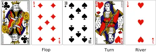 Kolejność wykładania kart wspólnych jest następująca:najpierw wykładany jest flop, czyli trzy karty, później turn i river, a więc po jednej karcie. Po każdym wyłożeniu następuje licytacja.