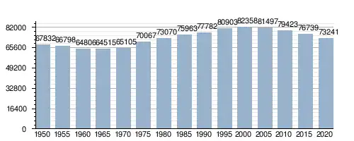 Zmiany w populacji terenu miasta w latach 1950–2020: