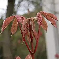 - Dłoniasto złożone z 5–7 karbowanych listków osadzonych na ogonkach do 3 cm długości. Mają długość 10–18 cm i spodnią część szaro omszoną. Brzegi są drobno karbowanopiłkowane. Wiosną liście są brązowe, jesienią przebarwiają się na kolor jaskrawożółty. Pąki zimowe nie są lepkie, są nieduże, tępe, jasnobrązowe.