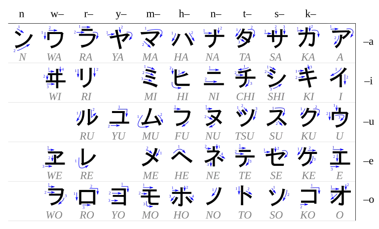 Poniższa tabela przedstawia sposób zapisu każdego znaku katakany. Liczby i strzałki wskazują kolejność i kierunek kresek.
