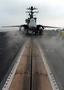 Układ, w którym samoloty startują z lotniskowców przy pomocy katapult startowych określa się angielskim skrótem CATOBAR. W celu zapewnienia bezpiecznego lądowania tego typu maszyn na pokładach lotniskowców konieczne jest stosowanie lin hamujących skracających dobieg samolotu.