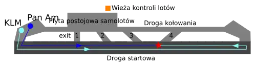 PAN AM (RADIO): Ale my dalej kołujemy po pasie, Clipper 1736. [Załoga KLM-u nie słyszy tej wypowiedzi z powodu interferencji w transmisjach radiowych.]
