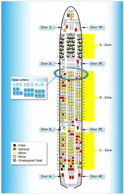 Na pokładzie samolotu znajdowało się 291 pasażerów i 16 osób załogi[2][3]. 2 osoby zginęły[2][4][5][6][7], jedna zmarła w szpitalu[8].