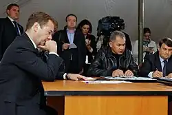 Prezydent Rosji Dmitrij Miedwiediew w trakcie spotkania ze śledczymi (obok Siergiej Szojgu i Igor Lewitin)
