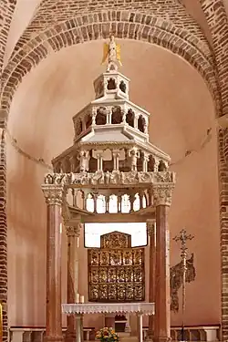 W apsydzie umieszczone jest romańsko-gotyckie cyborium z 2 poł. XIV w. stworzone przez miejscowego mistrza Wita Kotoranina. Składa się z czterech ośmiokątnych kolumn z czerwonego marmuru podtrzymujących trójpiętrowy baldachim zwieńczony figurką anioła. Dekorację rzeźbiarską stanowią sceny z życia świętego Tryfona, a obok srebrna płaskorzeźba, wykonana w połowie XV w. przez miejscowych złotników.