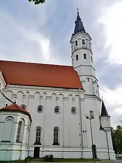 Kościół charakteryzuje się ponad 70–metrową ośmioboczną wieżą zakończoną szpicem widoczną z każdego punktu miasta. W świątyni znajduje się cudowny obraz Matki Boskiej oraz XVIII-wieczne organy przeniesionymi tu z kościoła św. Trójcy w Kownie.