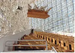 Świątynia została zbudowana z 10 tysięcy prostokątnych szyb i jest w stanie pomieścić 2900 osób. Wewnątrz sali znajdują się organy posiadające 320 głosów, skonstruowane przez Fratelli'ego Ruffatti. Szyby, z których zbudowany jest kościół, nie są mocowane do jego struktury, ale połączone ze sobą silikonem, co pozwala budynkowi przetrwać trzęsienie ziemi rozmiaru do 8 stopni. Konstrukcja kościoła rozpoczęła się w 1977 r. i zakończyła się w 1980 r. Łączny koszt budowy wyniósł 17 milionów dolarów (w przeliczeniu na obecne: 55 milionów dolarów).