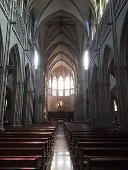 Świątynię zbudowano na planie krzyża łacińskiego, z nawą główną, dwoma nawami bocznymi, transeptem i pięcioboczną apsydą[1]. Katedra maksymalnie może pomieścić 4000 osób[3].