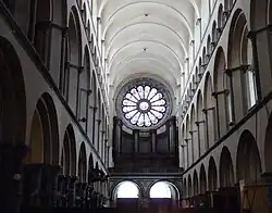 Romańska, dziewięcioprzęsłowa nawa główna o długości ponad 48 m, jest flankowana przez nawy boczne. W architekturze nawy wyróżnić można 4 poziomy. Dolny poziom stanowią długie ciągi półokrągłych łuków spoczywających na masywnych, okrągłych, bogato dekorowanych filarach. Na nimi biegnie ciąg galerii otwierających się do nawy głównej; ich filary, dekorowane smukłymi kolumnami, są prostsze w kompozycji. Trzeci poziom to rytmiczny ciąg fałszywych tryforiów, zbudowanych z półokrągłych arkad, po dwie w każdym przęśle, przedzielonych krótkimi kolumnami dekorowanymi pilastrami. Każda z arkad pierwotnie zawierała wnękę, obecnie zamurowaną. Ostatni poziom tworzą okna, zapewniające oświetlenie nawy głównej, przekrytej, podobnie jak nawy boczne, sklepieniem krzyżowym[6].