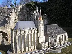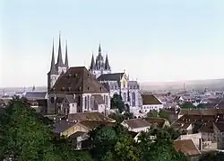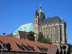 ![]() Katedra w Erfurcie – widok od strony wschodniej. Po prawej kościół św. Sewera | |||||||||||