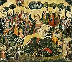We wschodniej części nawy południowej znajduje się tryptyk wykonany w pierwszej ćwierci XV wieku. Pole środkowe wypełnia przedstawienie Zwiastowania, jednakże w odmiennej formule ikonograficznej znanej jako polowanie na jednorożca. W symbolice maryjnej jednorożec oznaczał dziewictwo, stąd ukazano zwierzę przy Matce Bożej; przednie kopyta położył na Jej kolanach. Archanioł Gabriel ukazany jest bez skrzydeł, lecz jako myśliwy, dmący na rogu, w lewej ręce trzyma lancę. Jednocześnie przedstawiono w sposób symboliczny przyjście Chrystusa ze świata Bożego na świat ziemski, gdzie posłane przez Boga Ojca Dzieciątko Jezus lotem zmierza w stronę Marii. W ogrodzie zamkniętym (hortus conclusus) Marii towarzyszą Święte Dziewice i chóry anielskie. Poza ogrodzeniem klęczą dwaj duchowni (w tym biskup) i trzy siostry Zakonu Brygidek. Na skrzydłach bocznych Ukrzyżowanie (po lewej) oraz Zstąpienie Chrystusa do otchłani i Zmartwychwstania Pańskiego. Malowidła rewersów zachowały się w stanie szczątkowym.