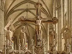 Prezbiterium jest oddzielone od reszty kościoła XV-wieczną bogato rzeźbioną przegroda chórowa, ponad nią na belce tęczowej, datowany na 1. ćw. XIII w. zespół rzeźb ukazujących Grupę Ukrzyżowania, pośrodku krucyfiks z Jezusem w typie Chrystusa Triumfującego.