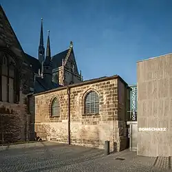 Zespół katedralny składa się z katedry, oraz zabudowań monasterium kanonickiego skupionych wokół czworobocznego wirydarza otoczonego zbudowanym w 2 ćwierci XIII w krużgankiem w stylu późnego romanizmu. Od strony zachodniej dwukondygnacyjny późnoromański budynek kryjący Tzw. Stary i Nowy Kapitularz, pierwszy z nich zachował pierwotny romański charakter. Ponad nimi refektarz, od strony wschodniej budynki dormitorium, oraz probostwa, gdzie znajduje się skarbiec. Ponadto do krużganków od strony wirydarza przylega Neuenstädter Kapelle (1503) – niewielka kaplica w której znajduje się późnogotycki tryptyk ze scenami m.in. Koronacji NMP, w oknach zachowało się kilka witrażyz XV wieku. Spośród licznych zgromadzonych w krużgankach zabytków (gł. płyty nagrobne) wyróżnia się wykonana z piaskowca figura Madonny z Dzieciątkiem w typie Sedes sapientiae, zwieńczona ozdobną konsolą i baldachimem.