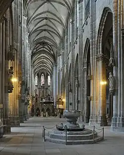 Architekturę wnętrza cechuje spójność, poszczególne partie pomimo iż zostały wzniesione w pewnym odstępstwie czasowym posiadają cechy wspólne, z czego wynika że istniała pewna określona koncepcja, którą konsekwentnie realizowano aż do zakończenia budowy. Wnętrze jest nakryte sklepieniem krzyżowo-żebrowym (częściowo w nawach bocznych i na skrzyżowaniu naw sklepieniem gwiaździstym), które jest wsparte na służkach przylegających do filarów. Ten zasadniczy szkielet architektoniczny oprócz funkcji konstrukcyjnej posiada cechy estetyczne. Powyżej arkad znajdują się triforia, ponad nimi okna, z dekoracją maswerkową. Okna w nawach są mniejsze niż w prezbiterium i kaplicy Mariackiej, gdzie ich powierzchnia zajmuje całe ściany. To wszystko stanowi cenny przykład recepcji francuskiego gotyku katedralnego na terenie Rzeszy. Do filarów przylegają naturalnej wielkości kamienne rzeźby świętych stojących na konsolach pod baldachimami. Ponadto zachowało się wiele elementów gotyckiej rzeźby architektonicznej – kapitele, wsporniki itp. To wszystko wraz z cennym wyposażeniem wnętrza wciąż tworzy integralną, jednolitą całość.