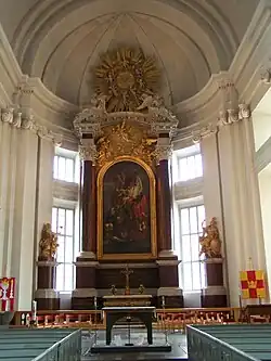 Wewnątrz świątyni uwagę przyciąga lśniący blaskiem ołtarz główny. Został on zaprojektowany w 1704 przez Nicodemusa Tessina Młodszego i wykonany w 1712 przez rzeźbiarza Caspara Schrödera. Ołtarz jest zwieńczony wyobrażeniem Ducha Świętego w postaci gołębicy, otoczonym świetlistą aureolą. Poniżej znajduje się scena ze stworzenia świata: Bóg czyniący światłość w ciemności. Ogromny obraz w ołtarzu, będący prawdopodobnie dziełem Davida von Kraffta, przedstawia w nietypowy sposób zdjęcie Chrystusa z krzyża: mężczyźni na drabinach opuszczają jego bezwładne ciało na linach.