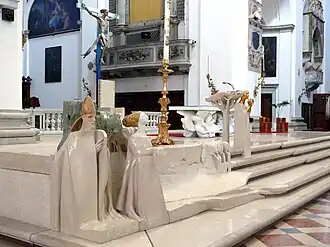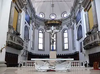 Prezbiterium odcina się stylem od reszty świątyni. Jego obecny wystrój został zainaugurowany w 1997 r. Jest ono ozdobione rzeźbami toskańskiego artysty Giuliano Vangi. Już na pierwszy rzut oka widać nowoczesność stylu. Wszystkie postacie, szczególnie aniołowie podtrzymujący ołtarz wydają się być w jakimś niezwykłym ruchu. Zamysłem twórcy było ukazać obecność Ducha Świętego, dlatego rzeźby sprawiają wrażenie, jakby były poruszane przez Jego tchnienie. Znajdujemy tam monumentalny krucyfiks w centrum oraz postacie świętych, między innymi św. Franciszka z Asyżu, św. Justyny, św. Prosdocimo i św. Grzegorza Barbarigo.