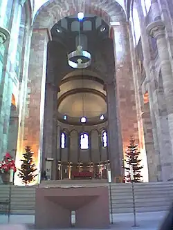Pomieszczenie budują charakterystyczne dla okresów salickiego i staufickiego bloki żółtego i czerwonego piaskowca z Haardt i Odenwaldu, ułożone naprzemiennie. Przed ołtarzem głównym stoi chrzcielnica z 1100.