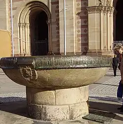 Znajdująca się przed zachodnim wejściem do katedry misa katedralna (niem. Domnapf), po raz pierwszy wspomniana w 1314, wyznaczała dawniej granicę pomiędzy wolnym miastem Rzeszy a terytorium biskupim, które cieszyło się immunitetem. Skazani na mocy prawa miasta uciekali na terytorium kościelne, gdzie obowiązywało prawo biskupie i gdzie nie mogli być ścigani przez władze miejskie.