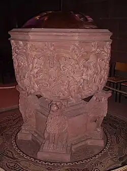 W absydzie wschodniego chóru znajduje się wielki barokowy ołtarz główny (dzieło Balthasara Neumanna z 1738-40). Obok w niszy późnoromański krucyfiks z XII w. W nawie głównej ambona z 1715 r. Na korpusie rzeźbione postaci czterech Ewangelistów, zwieńczenie zdobi anioł grający na trąbie. Ściany północnej nawy bocznej zdobi cykl późnogotyckich reliefów z XV w umieszczone w ostrołukowych niszach. Pierwszy z nich przedstawia Drzewo Jessego oraz postaci Doktorów Kościoła. Kolejny zdobiony ażurowymi wiciami roślinnymi ilustruje scenę Zdjęcia z Krzyża. W trzecim reliefie znajduje się scena Zwiastowania. W kaplicy Św. Mikołaja znajduje się późnogotycka chrzcielnica z 1485 r. misę chrzcielną wspierają pełnoplastyczne symbole czterech Ewangelistów. Bogata dekoracja znajduje się na zewnętrznych ściankach misy. Wśród licznych nagich sękatych gałęzi znajdują się płaskorzeźbione popiersia profoków starotestamentowych. Ołtarz Św. Mikołaja pochodzi z 1515 r., zaś znajdujący się na jednej ze ścian relief z postaciami świętych Dziewic z 1430 r. Zachowały się także liczne dzieła rzeźby architektonicznej z XII-XV w. rozmieszczone w różnych miejscach świątyni.