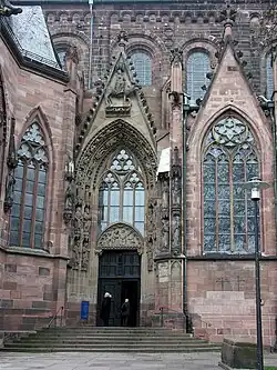 Prowadzące do nawy południowej wejście poprzedza gotycka kruchta z monumentalnym portalem. Profilowane ościeża i archiwolta wysokiego ostrołukowego portalu zdobią liczne pełnoplastyczne figury które stoją piętrowo na ozdobnych konsolach. Przedstawiają one czterech ewangelistów (po lewej) oraz proroków starotestamentowych (po prawej). Powyżej zaś postaci Boga Ojca trzymającego sferę niebiańską, św. Elżbiety Węgierskiej, personifikacje Synagogi i Luxurii. Na archiwoltach rzeźbione przestawienia figuralne, podzielone na dwie strefy. Strefa wewnętrzna ukazuje cykl scen ze Stary Testament (od stworzenia Adama i Ewy do Wniebowstąpienia Eliasza). W strefie wewnętrznej przedstawiono wybrane wątki z Nowego Testamentu (od Narodzin Chrystusa do Wniebowstąpienia Pańskiego). Na wimperdze postać Eklezji. Portal ten wewnątrz mieści starszy portal umieszczony poniżej okna nawy. Zdobi go wczesnogotycki tympanon z płaskorzeźbionym przedstawieniem Koronacji Marii. Po bokach adorują ich Święty Piotr oraz biskup Wormacji (identyfikowany z Emicho, Rheingrafem von Baumburg lub jego następcą Eberwinem von Kronenberg, biskupami przełomu XIII i XIV w., kiedy to powstał ów portal).