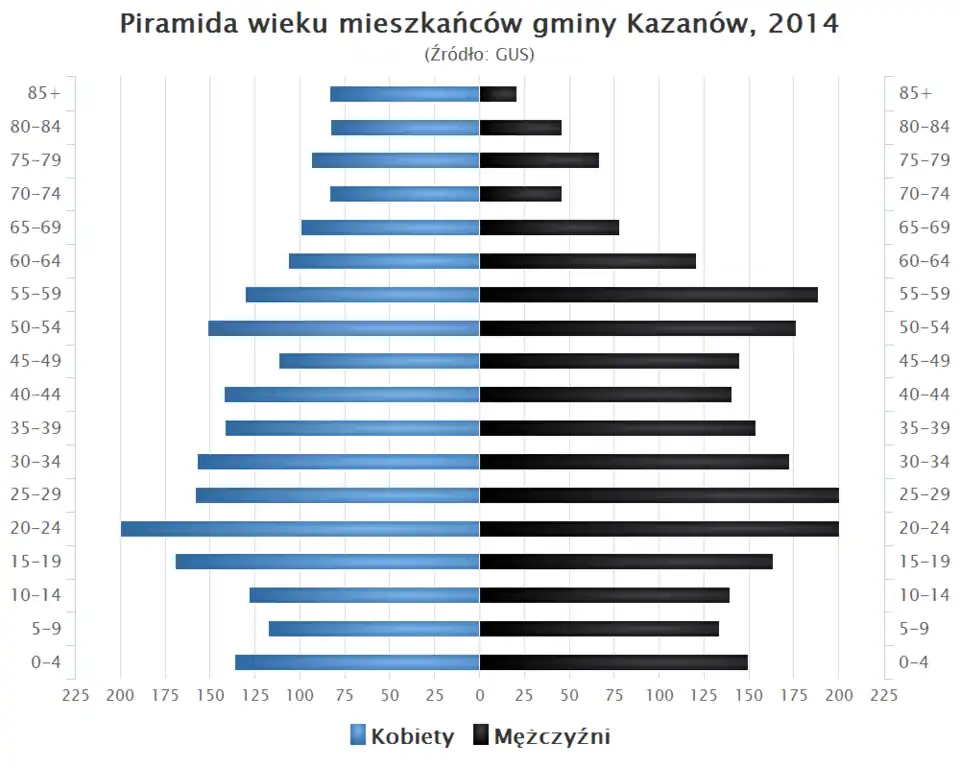 - Piramida wieku mieszkańców gminy Kazanów w 2014 roku[7].