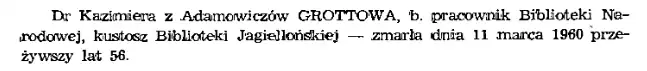 - ↑ S. Wilczyński, Wspomnienie o Kazimierze z Adamowiczów Grottowej, „Biuletyn Biblioteki Jagiellońskiej” 1960, nr 1, s. 27.