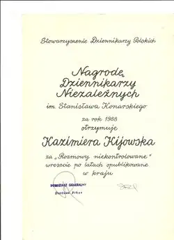 W 1988 została wyróżniona nagrodą Dziennikarzy Niezależnych im. Stanisława Konarskiego za książkę Rozmowy niekontrolowane która była cyklem anonimowych wywiadów z najważniejszymi postaciami opozycji demokratycznej. Rozmowy niekontrolowane były odczytywane i rozpowszechniane na bieżąco przez Radio Wolna Europa.